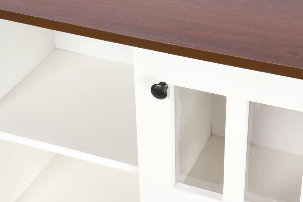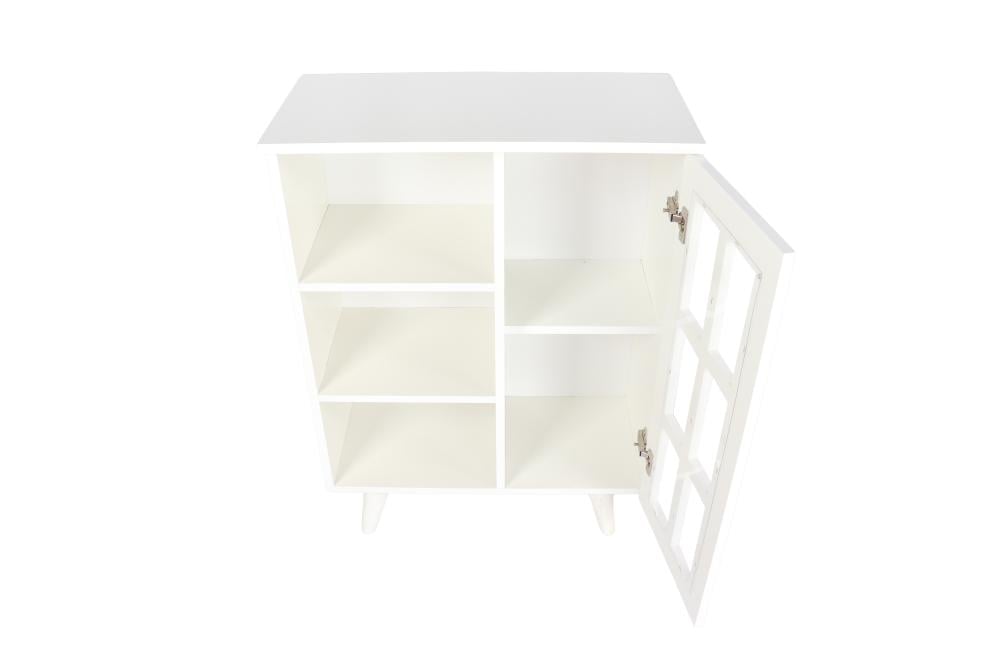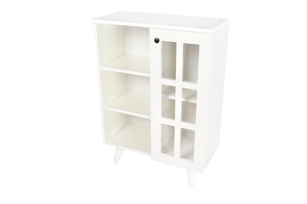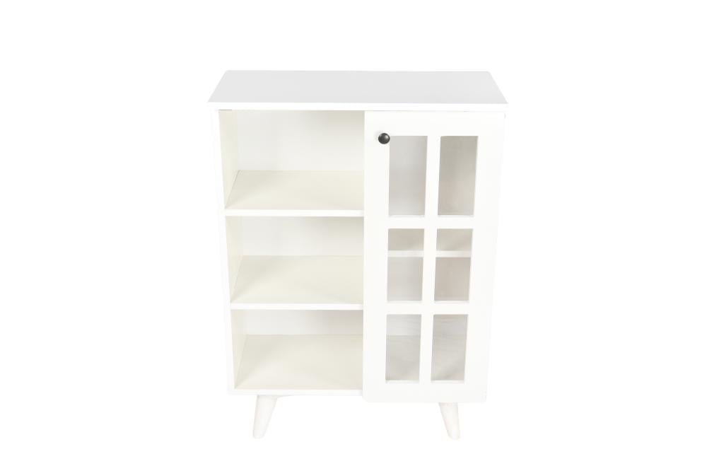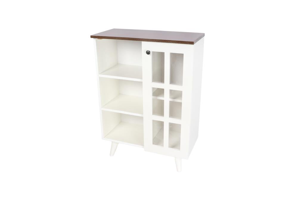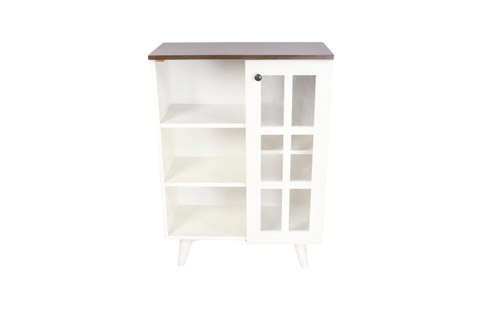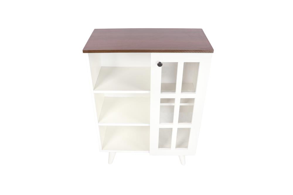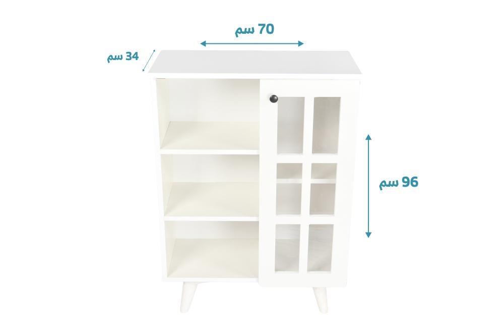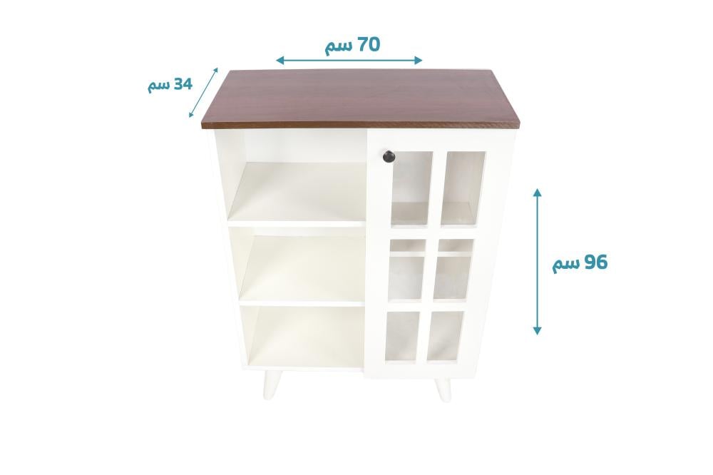 الجزء العلوي الواسع يوفر مكانًا مثالياً لتحضير القهوة وعرض بعض الديكورات الصغيرة، بينما توفر الأرفف السفلية مساحة تخزين إضافية لجميع مستلزمات القهوة الخاصة بك. كما يتميز بباب خشبي شفاف أنيق يمكنك من خلاله عرض أكوابك المميزة أو أي أدوات تود إظهارها.