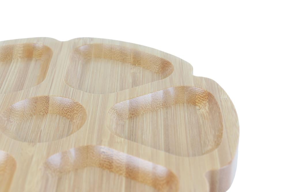 تحتوي اللوحة على ستة أقسام مخصصة، مما يسهل تقديم مجموعة متنوعة من المقبلات أو الحلوى بطريقة منظمة وجذابة. السطح الأملس للخشب لا يوفر فقط مظهرًا أنيقًا، بل يجعل أيضًا عملية التنظيف سهلة وسريعة.