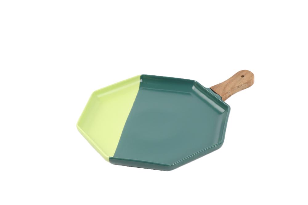 هذا المنتج عبارة عن طبق تقديم أنيق وعصري يتمتع بتصميم فريد. يأتي بشكل ثماني الأضلاع، مقسم إلى قسمين بألوان متباينة؛ نصفه بلون أخضر فاتح والنصف الآخر بلون أخضر غامق، مما يضفي عليه جمالية متناغمة. يتميز الطبق بمقبض خشبي طبيعي مدمج، مما يسهل حمله ويمنحه لمسة دافئة وطبيعية. يُظهر التصميم مزيجًا رائعًا بين الحداثة والبساطة، وهو مناسب لتقديم الأطعمة بطريقة مبتكرة وجذابة.