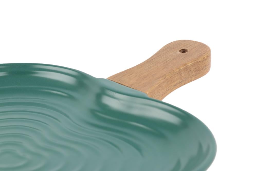 تضفي التفاصيل المنقوشة على سطح الطبق عمقًا وملمسًا مميزًا، بينما يضيف المقبض الخشبي لمسة طبيعية ودافئة، مما يسهل حمله وتقديمه.