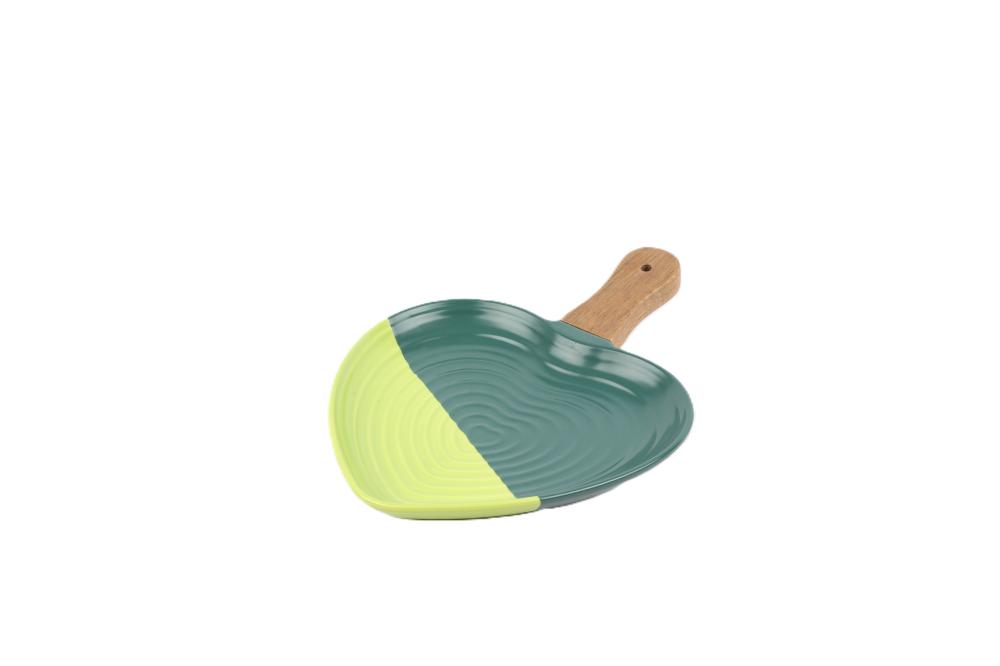 تتميز هذه الطبق بتصميمها الجذاب والفريد، حيث تأتي بشكل قلب يضيف لمسة من الرومانسية إلى أي طاولة. مصنوعة من السيراميك، تتميز بلونين متباينين؛ الجزء الأيمن بلون أخضر عميق والجزء الأيسر بلون أخضر فاتح، مما يخلق تباينًا بصريًا رائعًا.