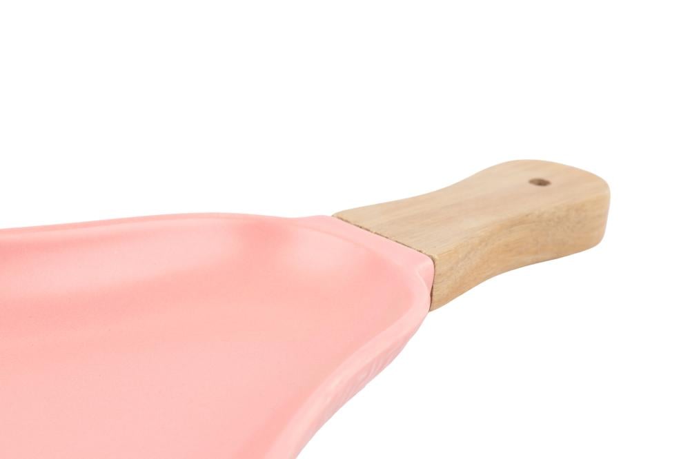 الطبق مزود بمقبض خشبي مصقول بعناية، مما يسهل حمله ويوفر لمسة دافئة وطبيعية. تصميمه يجمع بين البساطة والابتكار، مما يجعله مثاليًا لتقديم الأطعمة أو الحلويات بطريقة فريدة. هذا الطبق ليس فقط أداة عملية، بل أيضًا قطعة ديكور تضفي لمسة من الأناقة على طاولة الطعام.