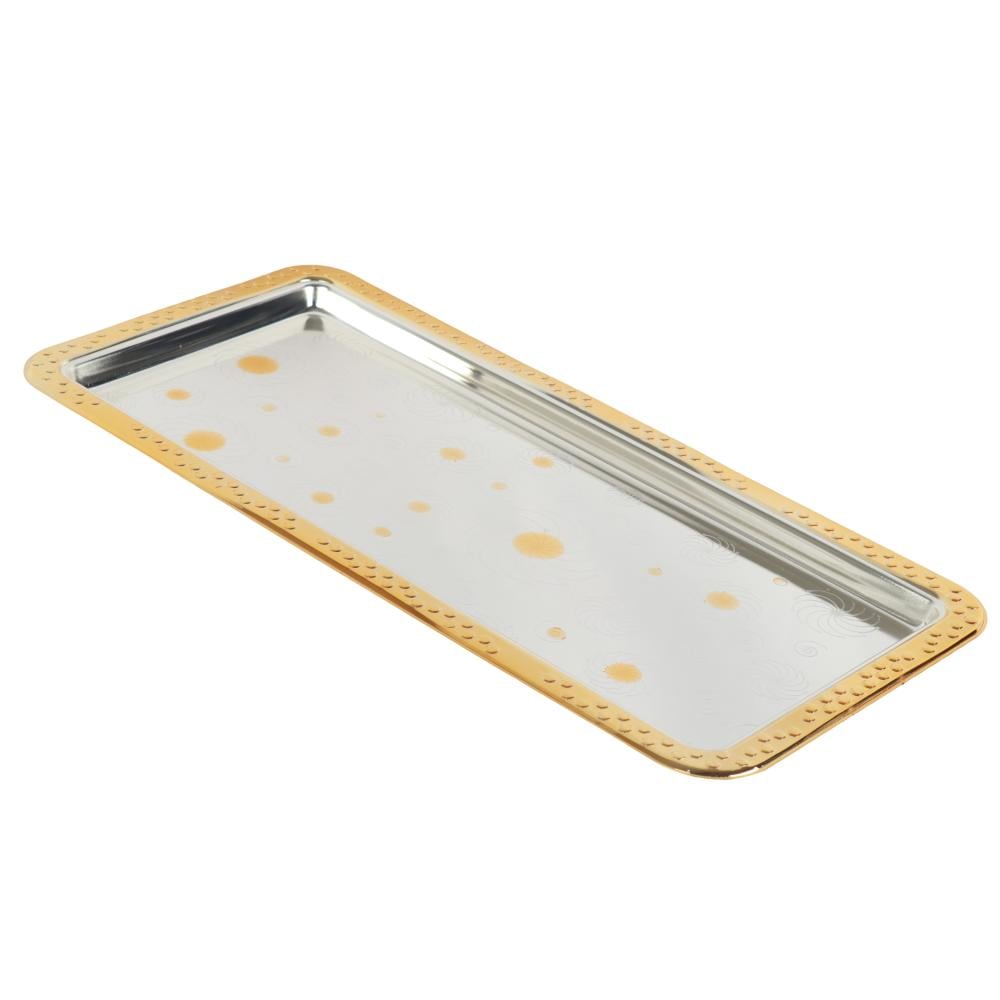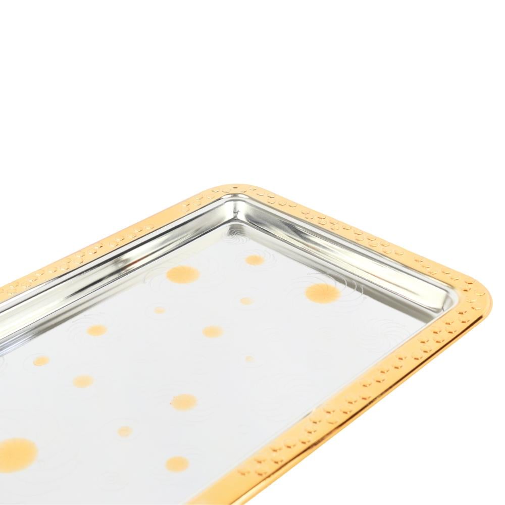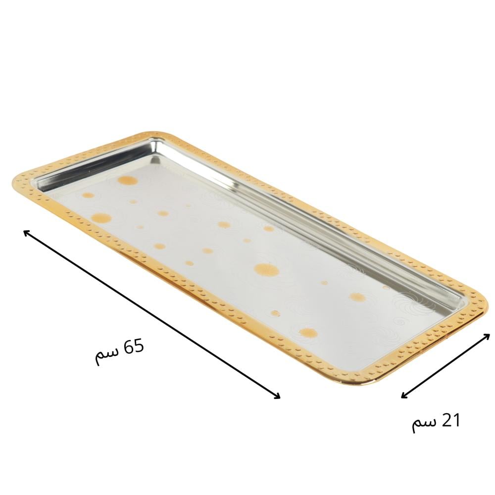 يحاط السطح العاكس بإطار ذهبي مزخرف بدقة، مما يمنح الصينية لمسة من الرقي والتفاصيل الفنية. تصميمها المستطيل يجعلها مثالية لتقديم مجموعة متنوعة من الأطعمة، بدءًا من المقبلات وحتى الحلويات.