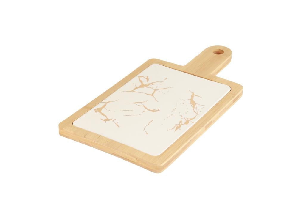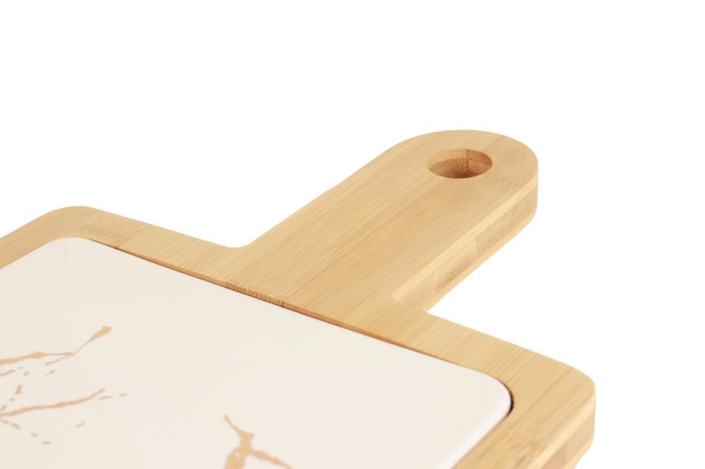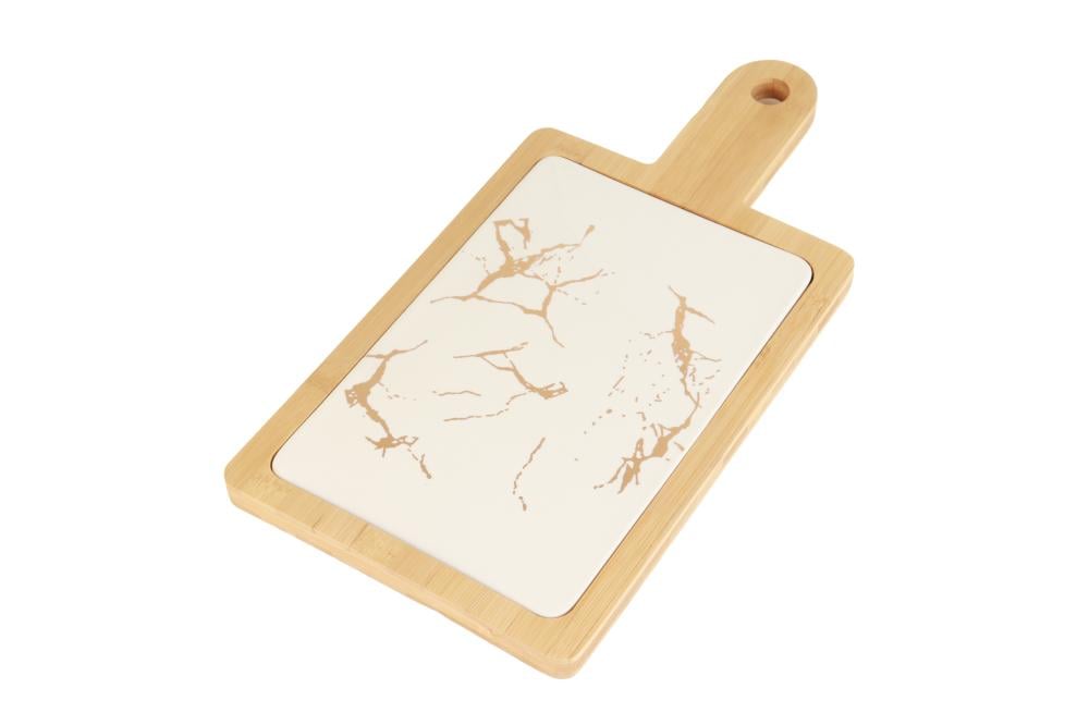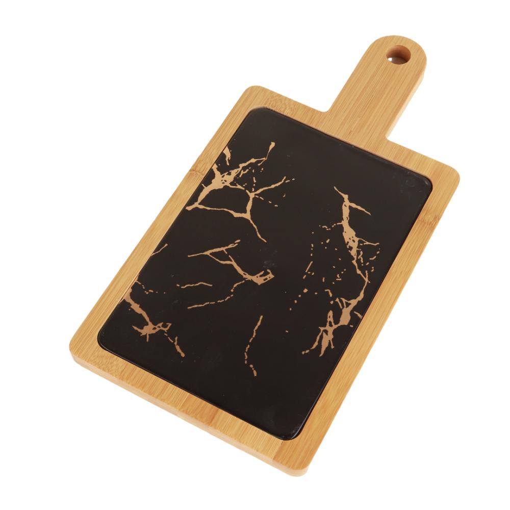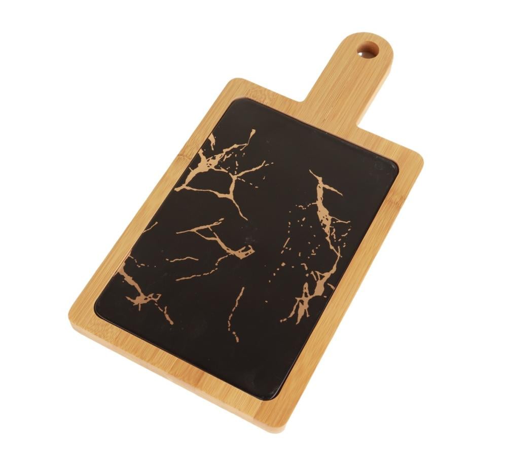 صحن حلا مستطيل سيراميك بإطار ومقبض خشب - أسود رخامي / أبيض رخامي