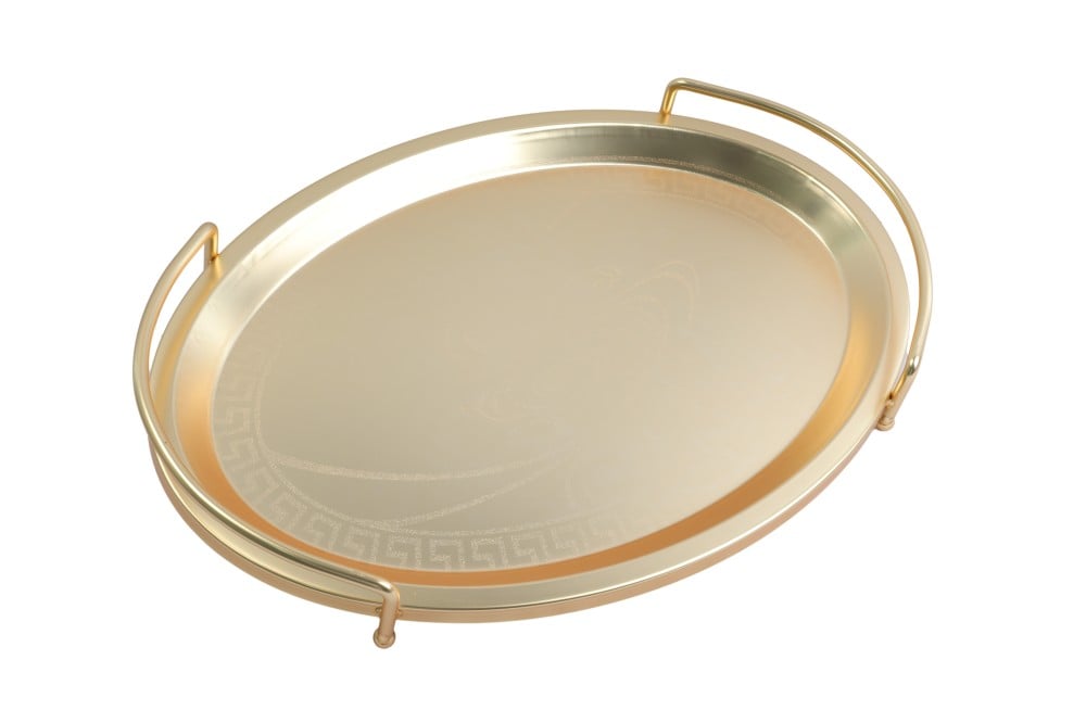 صينية تقديم من شركة هوم فيو مصنوعة من مواد عالية الجودة تسمح بالاستخدام المكثف, مصممة بتصميم ملكي انيق تتميز باللون الذهبي اللامع والنقوش الفاخرة مع مقبضين لتسهيل الإمساك والتقديم, اللون الذهبي المطلي لا يتغير بعوامل الطبيعة, تمثل هذه الصينية المميز إضافةً ساحرة إلى مجموعة التقديم الخاصة بك