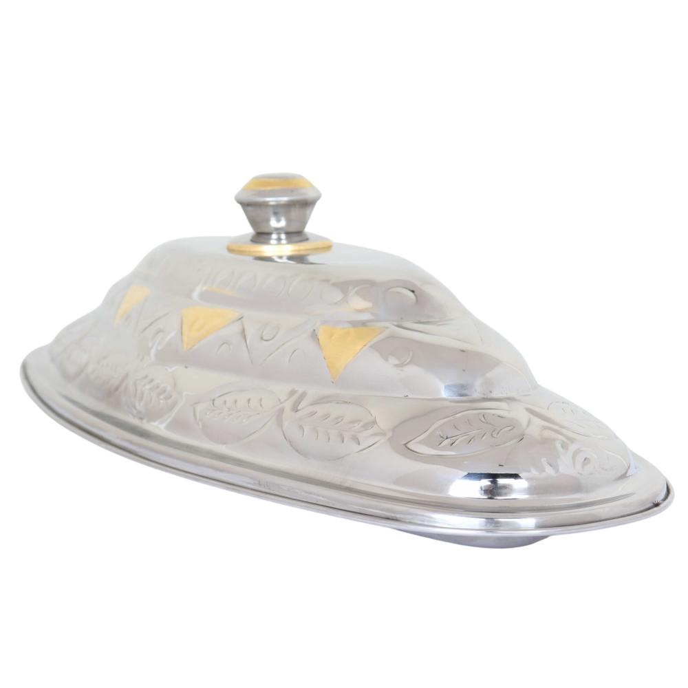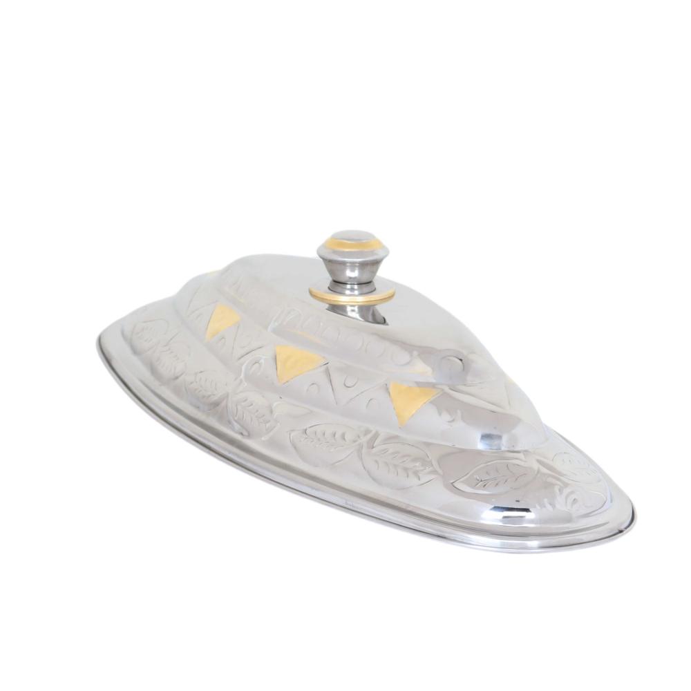 أهلاً بك! إليك وصف لصينية غوزي مستطيلة بطول 70 سم مصنوعة من الاستانلس ستيل الفضي، مزينة بنقشة ذهبية، ومرفقة بغطاء أنيق: