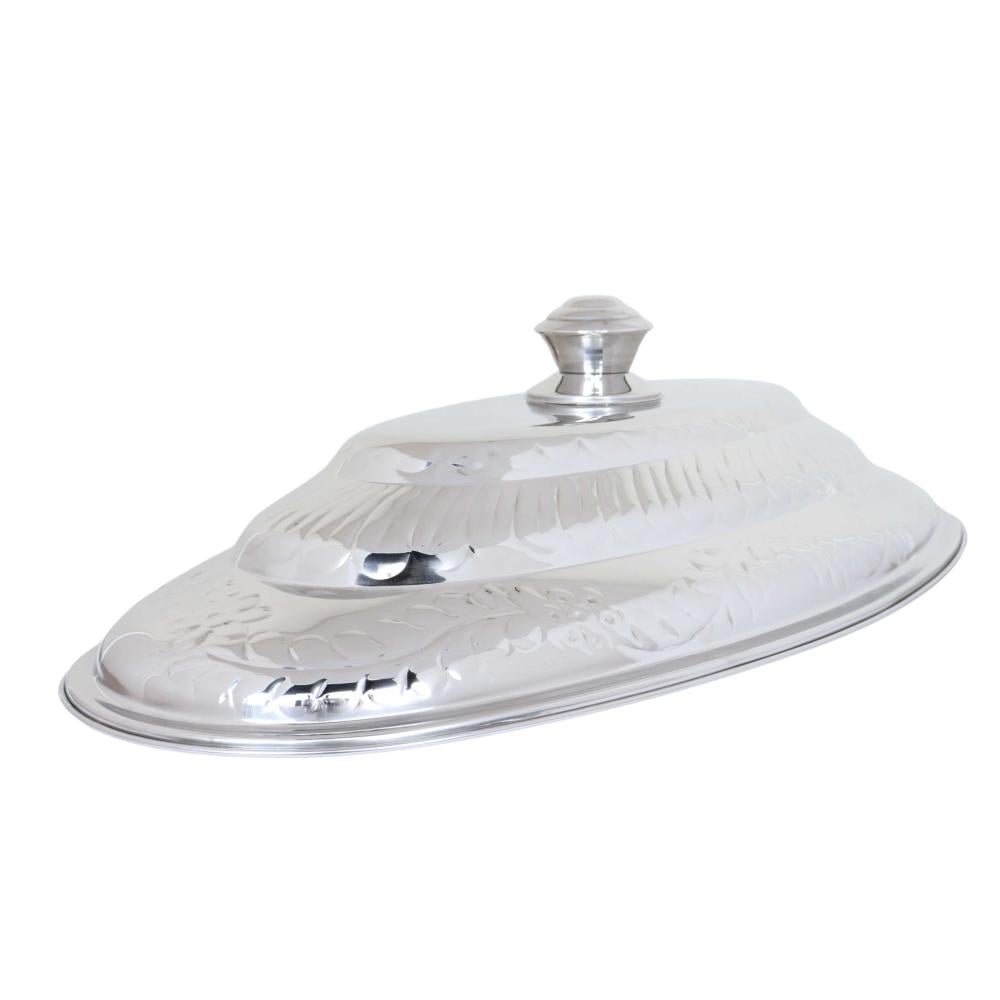 - غطاء مصمم بأناقة: يأتي مع الصينية غطاء مصمم خصيصاً ليتناسب مع شكلها البيضاوي ويكمل أناقتها. قد يكون الغطاء مصنوعاً من نفس مادة الاستانلس ستيل المنقوش أو من مادة شفافة عالية الجودة مزينة بلمسات من الاستانلس ستيل.