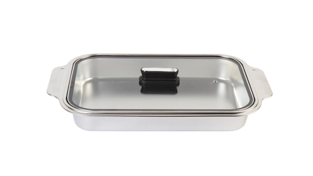 صينية فرن أنيقة مصنوعة من الستانلس ستيل ، تأتي بغطاء زجاجي شفاف يسمح بمتابعة الطهي دون الحاجة إلى فتحه.