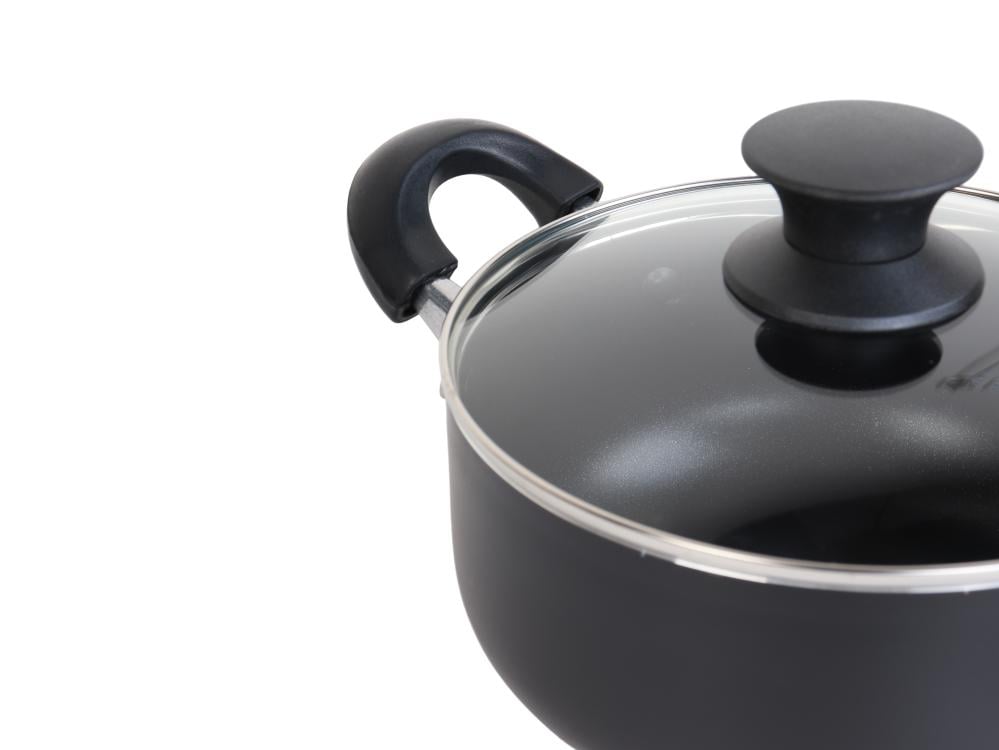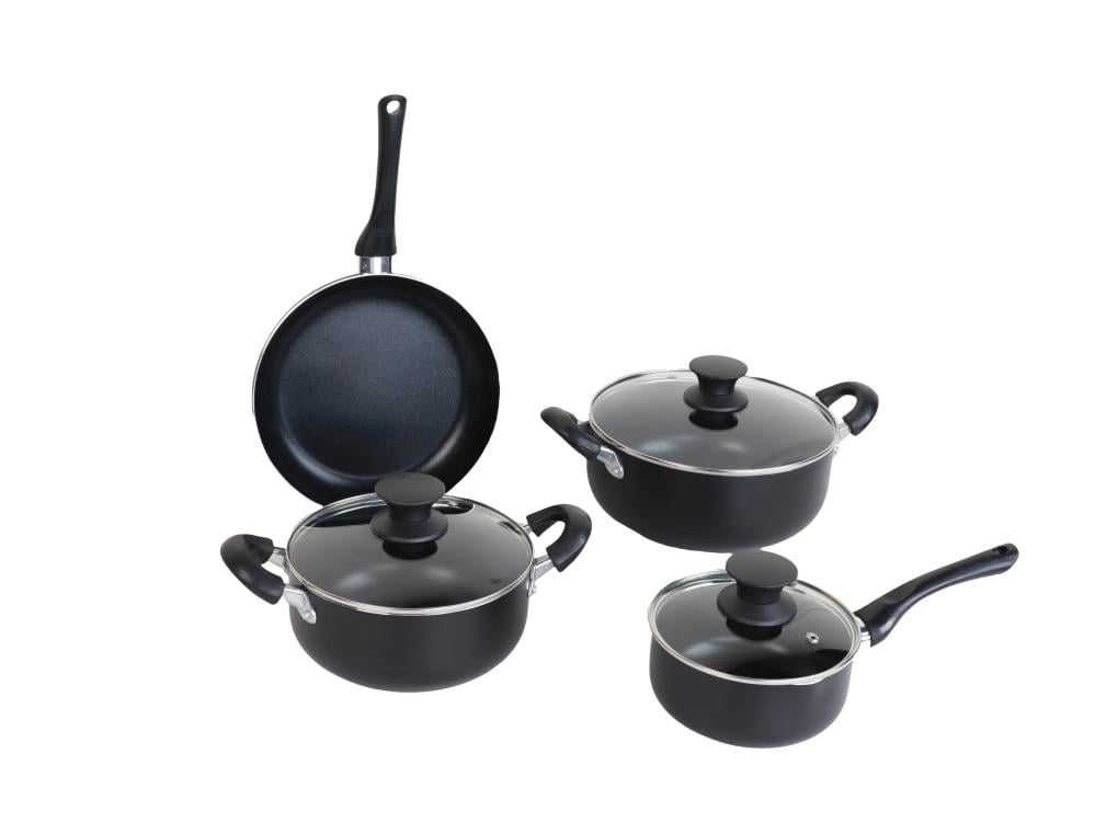 طقم ادوات طهي وقدور من شركة هوم فيو, مكون من 4 قطع متعددة الاستخدامات, مصنوع من مادة الالمنيوم عالية الجودة ومطلي بمادة التيفال المقاوم للالتصاق والصدأ, صمم هذا الطقم بتصميم عملي ومريح ومناسب للإستخدام اليومي, يحتوي الطقم على عدة احجام واشكال مختلفة ( 16 , 20 , 24 , 24 ) سم