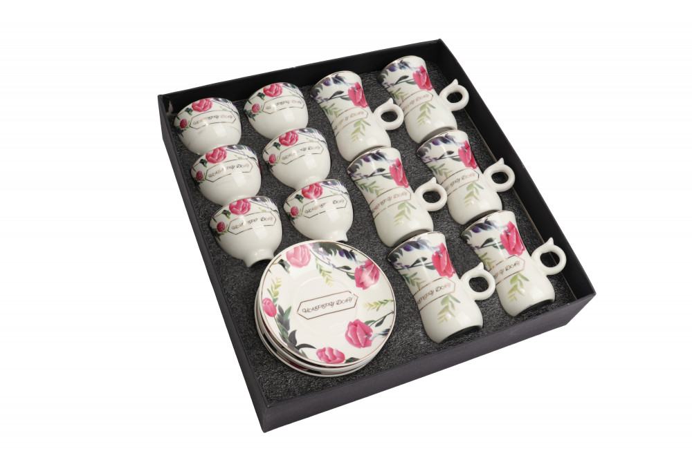 طقم قهوة و شاي مكون من 18 قطعة, طقم راقي جدا مكون من ستة فناجين قهوة و ستة فناجين شاي وستة صحون مصنوع من اجود أنواع السيراميك, هذا الطقم يتميز بنقوشه باللون الوردي مع اللون الابيض مما يجعله خيار مثالي للتقديم للضيوف
