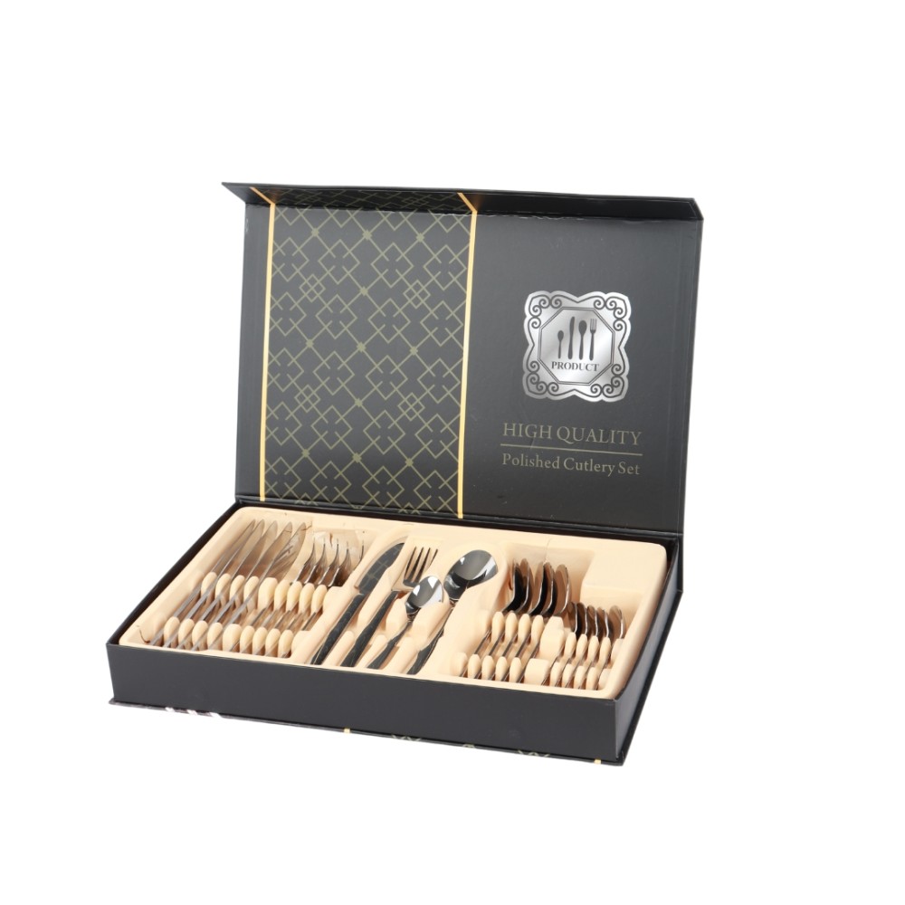 يحتوي الطقم على تشكيلة واسعة من السكاكين والشوك والملاعق لتلبية احتياجات الطعام المختلفة. الأدوات مصنعه من مواد مقاومة للصدأ عالية الجودة، مما يجعلها متينة وتدوم طويلاً. يتميز الطقم بتصميم أنيق وجذاب يضفي لمسة جمالية على مائدة الطعام. الأدوات مصممة بمقابض مريحة لسهولة الاستخدام والتحكم. سهلة التنظيف والصيانة، و آمنة لوضعها في غسالة الصحون. مقاومة للصدأ والتآكل، مما يجعلها تبدو جديدة لفترة أطول. مناسبة للاستخدام اليومي في المنزل أو في المطعم. يمكن تخزين الأدوات بسهولة داخل الأدراج أو على الرفوف.