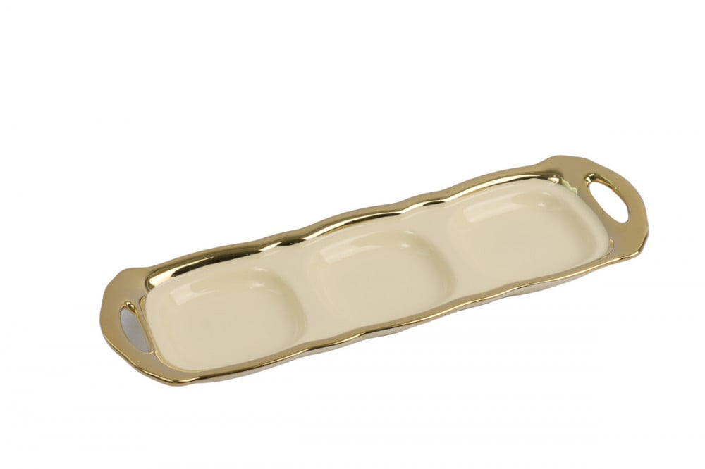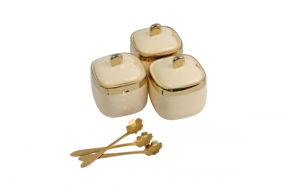 طقم سكريات وبهارات 3 قطع لون بيج مصنوع من اجود أنواع السيراميك الصافي تتمتع بشكل عصري وانيق مع ملاعق أنيقة وجميلة استيل لون ذهبي مع صينية تضيف مزيدا من الاناقة الى السكريات, هذه السكريات ستضيف حتما لمسة رائعة الى مطبخك