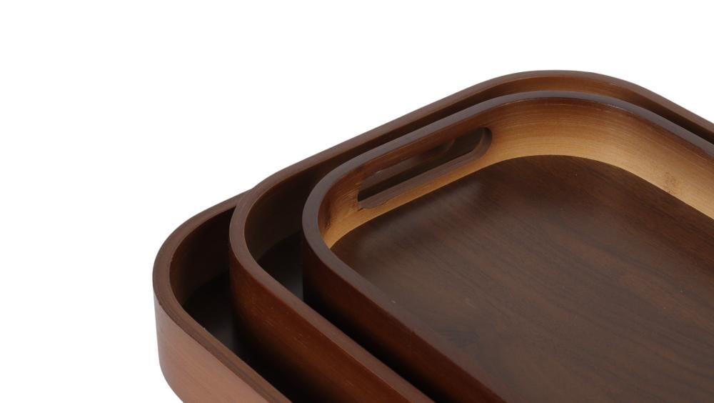 طقم أنيق من صواني التقديم الخشبية بتصميم عملي وجمالي فاخر، مصنوع من خشب عالي الجودة يمنح متانة ومظهرًا دافئًا طبيعيًا.