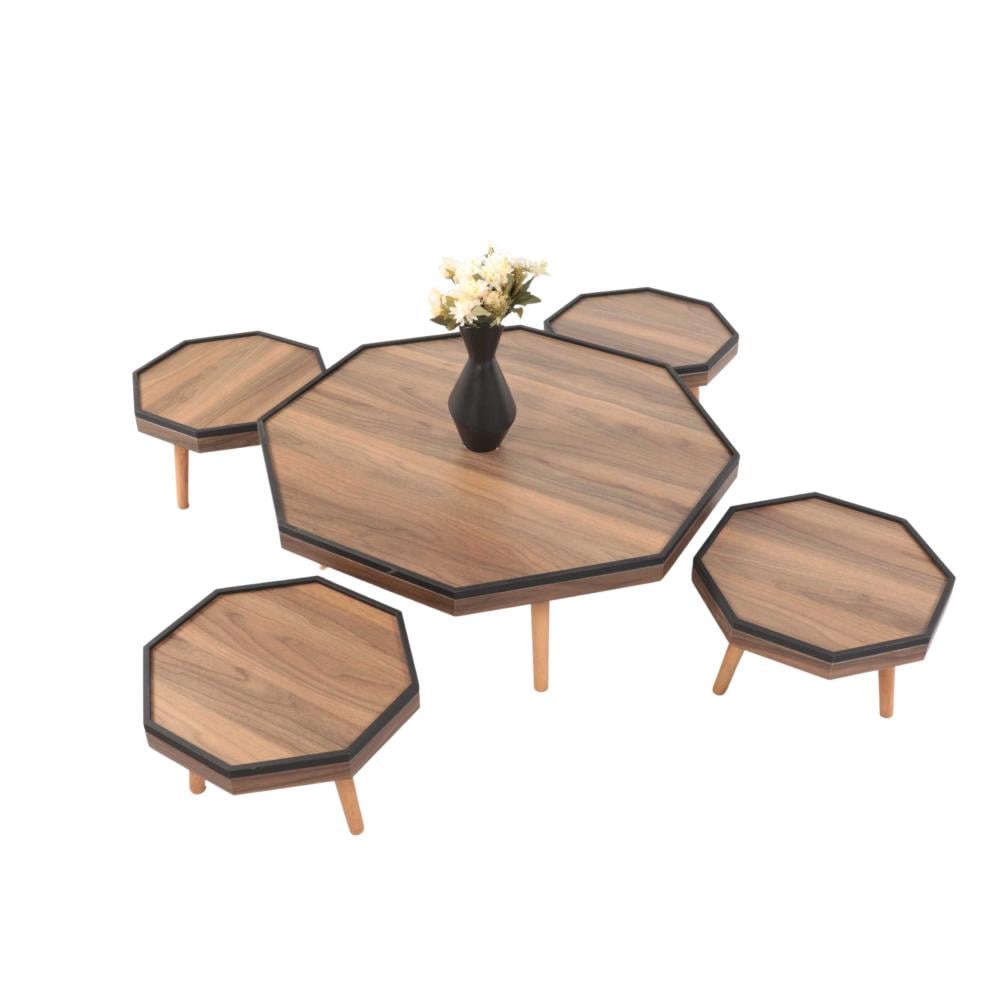 طقم طاولات خدمة أنيق وعصري يتكون من طاولة رئيسية واحدة وأربع طاولات جانبية عملية، مصممة لتلبية احتياجات ضيافتك وراحتك. يتميز الطقم بلون بني دافئ يضفي لمسة من الأناقة الكلاسيكية مع لمسة عصرية تناسب مختلف الديكورات. ترتكز الطاولات على أرجل خشبية متينة تضمن الثبات والاستدامة، وتعكس جودة التصنيع والاهتمام بالتفاصيل. هذا الطقم مثالي لتقديم المشروبات والوجبات الخفيفة للضيوف أو استخدامه كسطح إضافي متعدد الاستخدامات في غرف المعيشة أو الاستقبال.