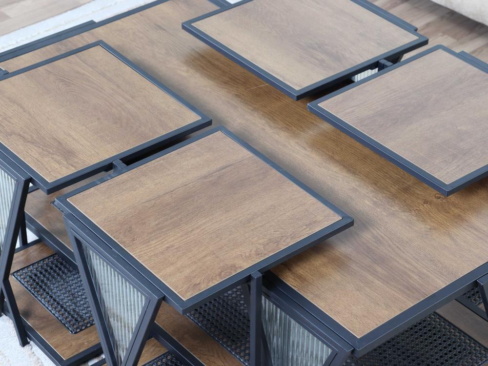 طقم طاولات خدمة بتصميم عصري وأنيق، يجمع بين الخشب الطبيعي وقاعدة الخيزران.