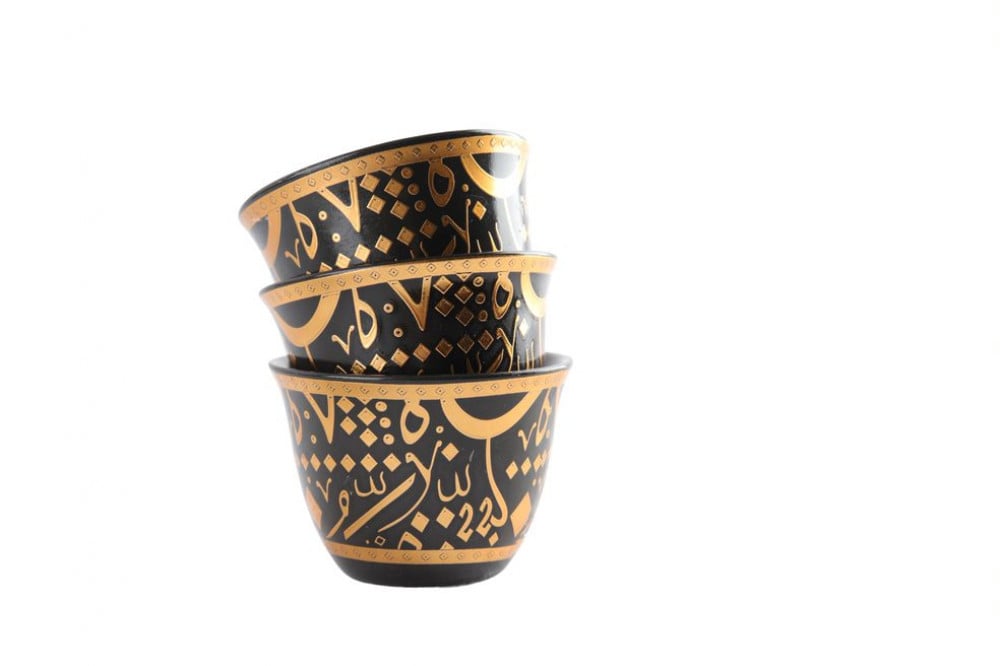 طقم فناجين قهوة عربية, الطقم مصنوع من البرسلان عالي الجودة, طقم باللون الأسود بحروف ذهبية, مصمم بتصميم فاخر وملكي ذو الوان راقية وعصرية, الطقم يتضمن 12 فنجان داخل صندوق ليكون خيار مثالي للإهداء او للاستخدام الشخصي.