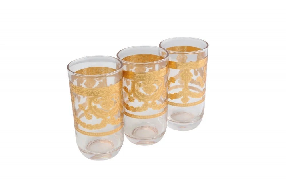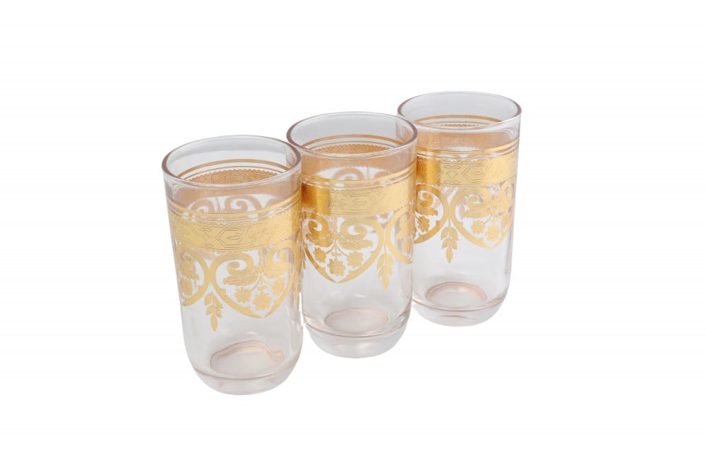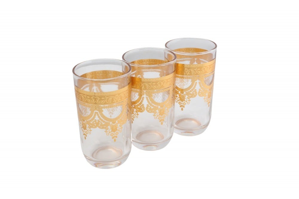 طقم كاسات 3 قطع من شركة هوم فيو, مصنوع من الزجاج عالي الجودة وبنقش ذهبي انيق, مصمم بشكل يجمع بين الحداثة والعملية فهو مثالي للاستخدام اليومي او في الحفلات المناسبات, لا يتأثر بالغسل ولن يمتص البقع أو الروائح, مثالي لتقديم مجموعة مختلفة من المشروبات مثل الماء والعصائر والمشروبات الغازية وما شابه