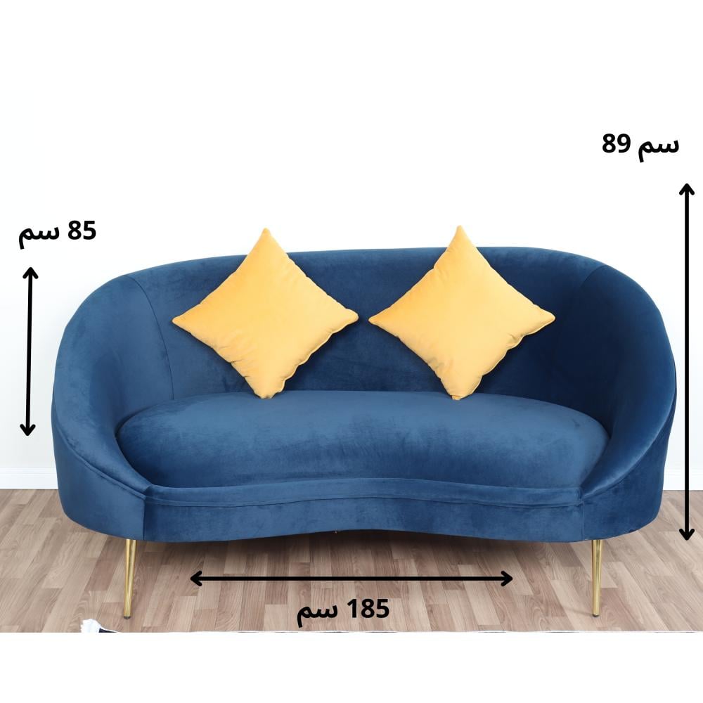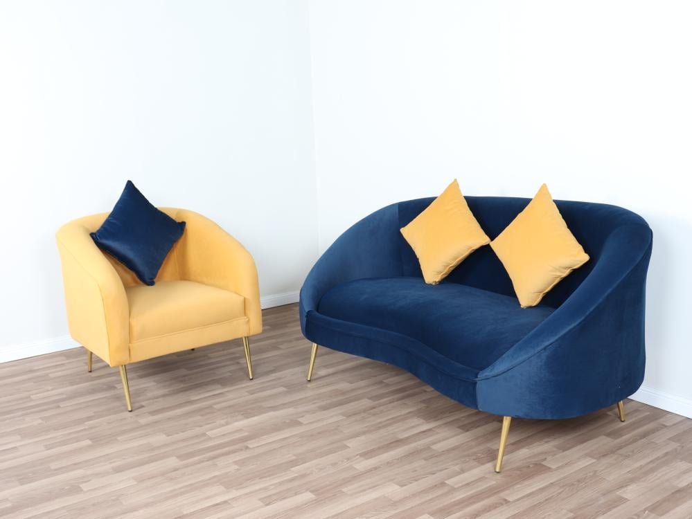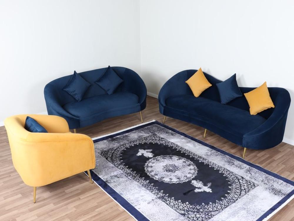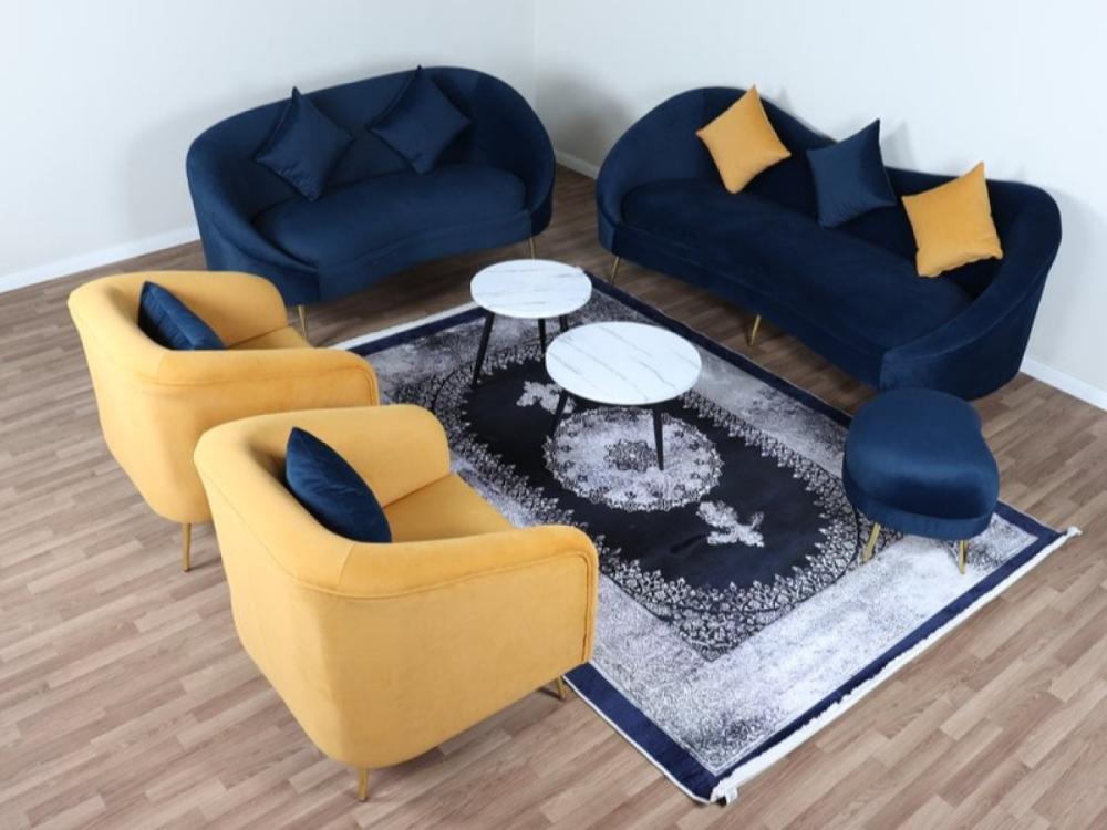 طقم كنب 7 أشخاص مخمل بأرجل ستانلس ستيل مذهبة - أزرق وبرتقالي