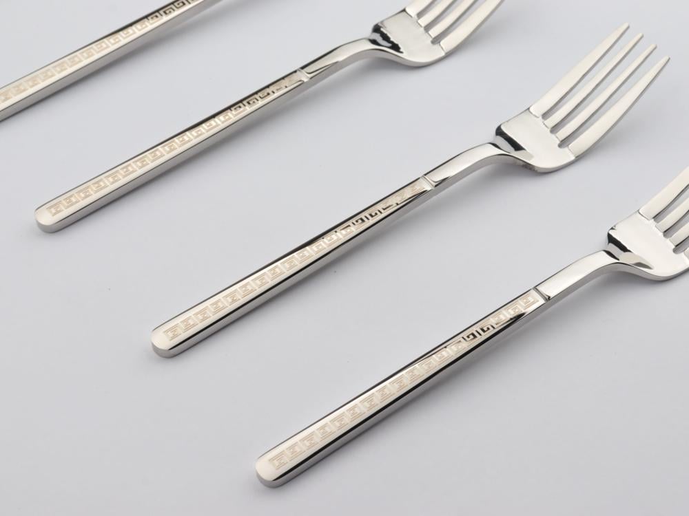 تصميم مزخرف أنيق: تتميز الشوك بنقوش دقيقة على المقبض، مما يضيف لمسة من الفخامة ويجعلها قطعة فنية في أي مجموعة أدوات مائدة.