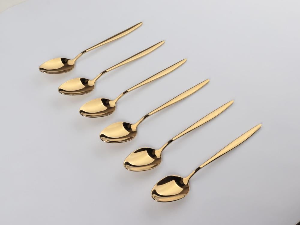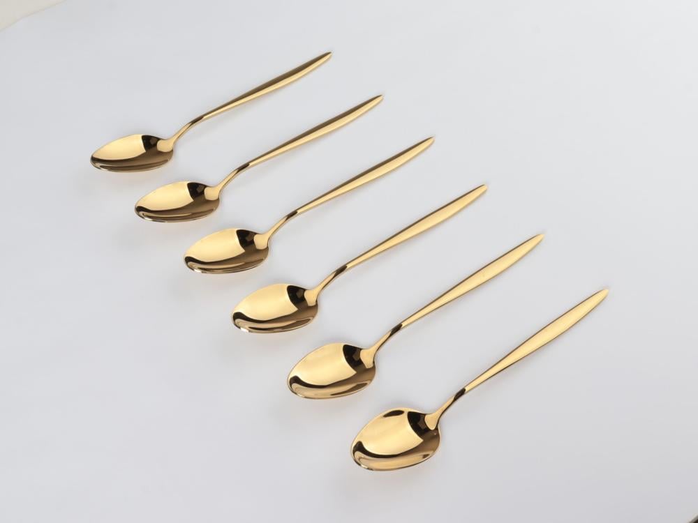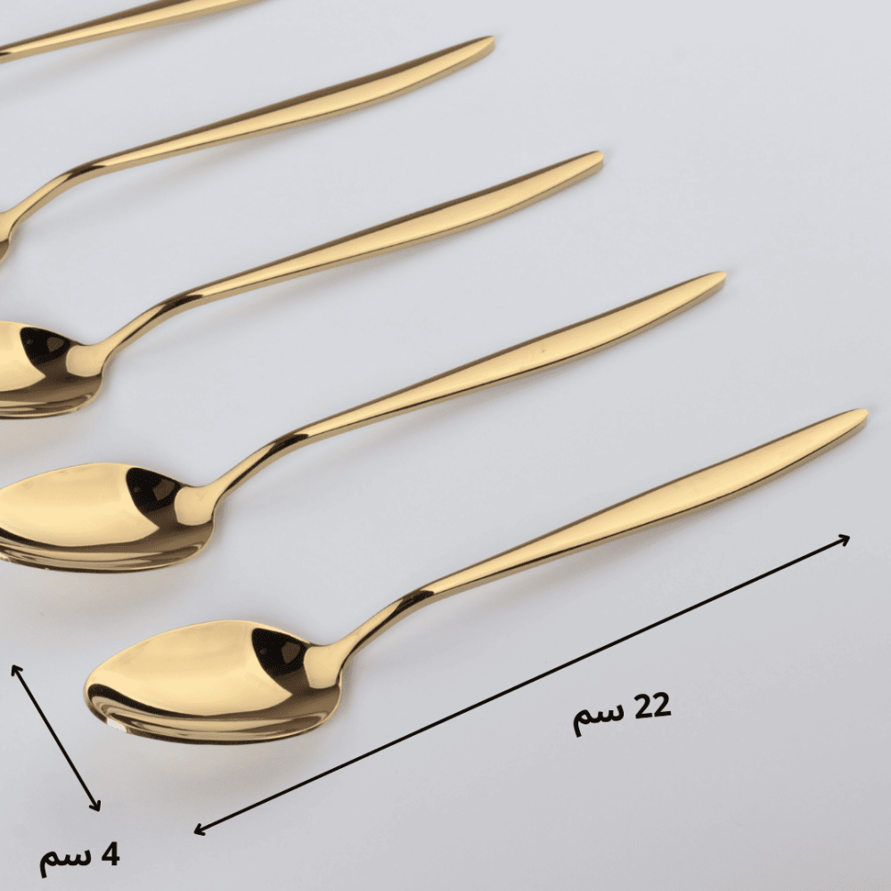 مجموعة الملاعق الذهبية المصنوعة من الستانلس ستيل اللامع، التي تضيف لمسة من الرقي والفخامة إلى مائدتك. تتكون هذه المجموعة من 6 قطع بتصميم عصري، مما يجعلها الخيار المثالي للمناسبات الخاصة والاحتفالات.