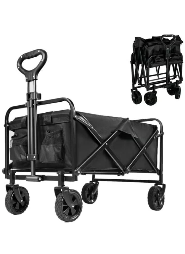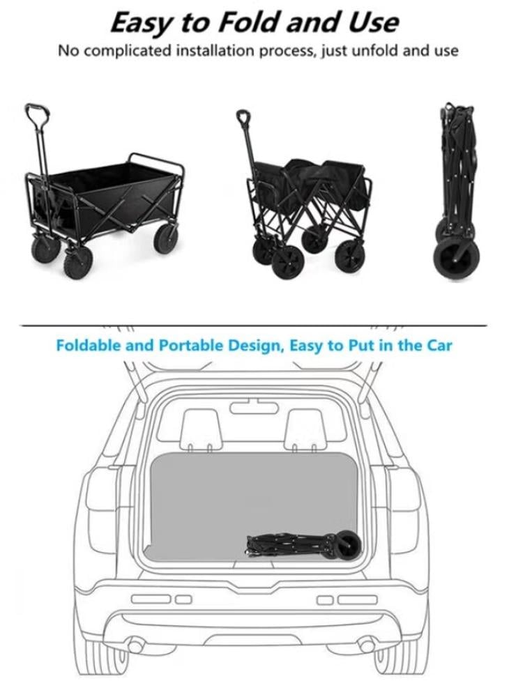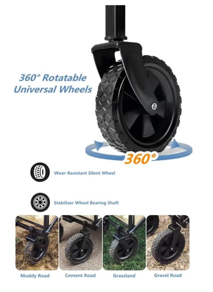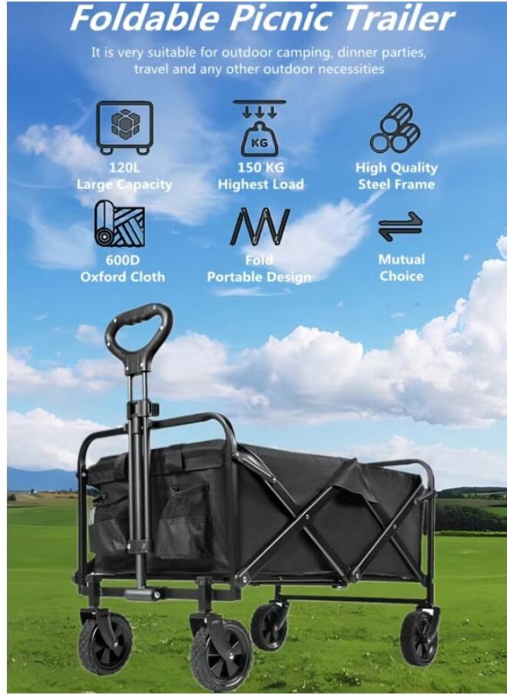 عربة بعجلات كبيرة قابلة للطي, يمكن استخدامها للتخييم والنزهات والتسوق، ويمكن أيضًا استخدامها لتخزين الكتب والأدوات وما إلى ذلك. تتمتع العربة بسعة كبيرة جداً حتى تتمكن من استيعاب مجموعة متنوعة من العناصر, تتميز بعجلات كبيرة وذات جودة عالية تضمن لك سير سلس وسهل مع مقبض مريح ومتين, يمكنك طيها وتخزينها بسهولة حيث انها لا تشغل مساحة كبيرة في البيت او السيارة.