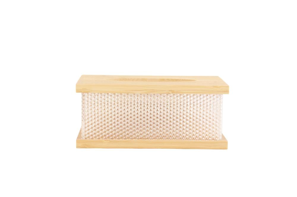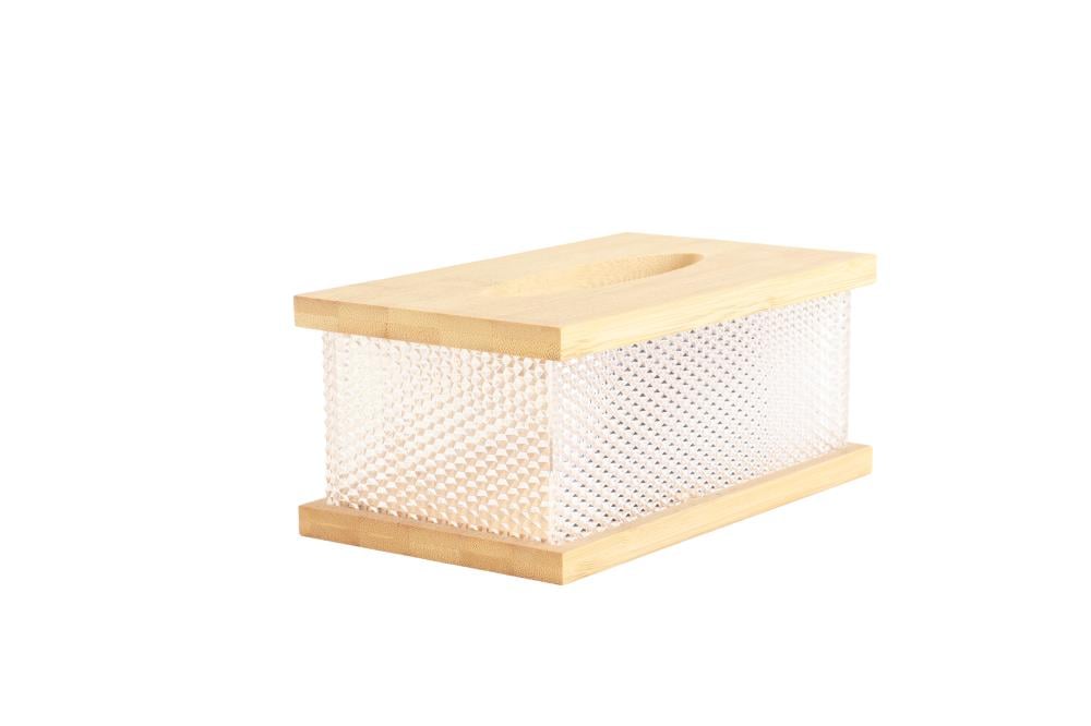 علبة منديل بغطاء خشبي علوي وسفلي مع جسم من الاكريليك الشفاف - تصميم عصري وأنيق