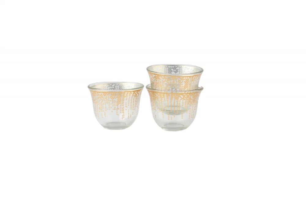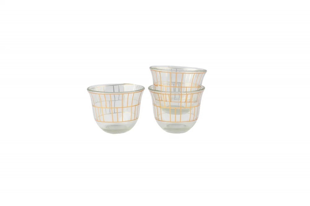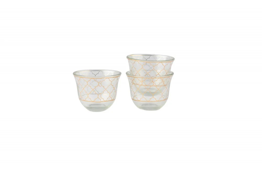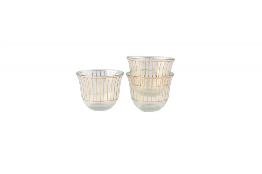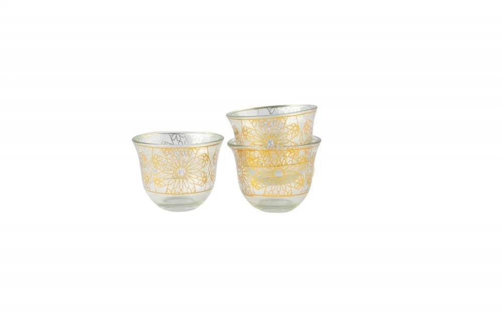 طقم فناجين قهوة مذهب, مصمم بتصميم كلاسيكي انيق يجعل ضيافتك راقية وملفتة ، الطقم مكون من 12 فنجان مصنوع من انقى واجود انواع الزجاج والذي يقاوم التقاط البقع والروائح وامن للاستخدام في غسالات الصحون.